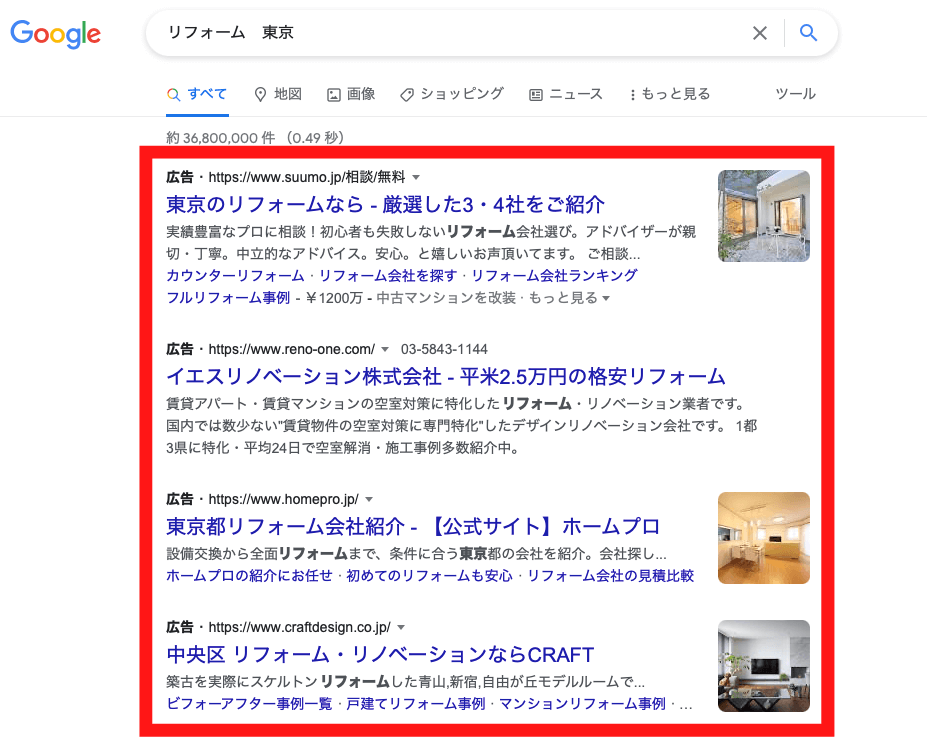 元々リフォームに興味を持って検索を行った顕在層に広告を発信できるため、非常に効率よく、大きな宣伝効果を期待できるでしょう。