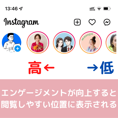 エンゲージが低くてもストーリーズの左に表示されるため、見られやすい大きなメリットがあります。