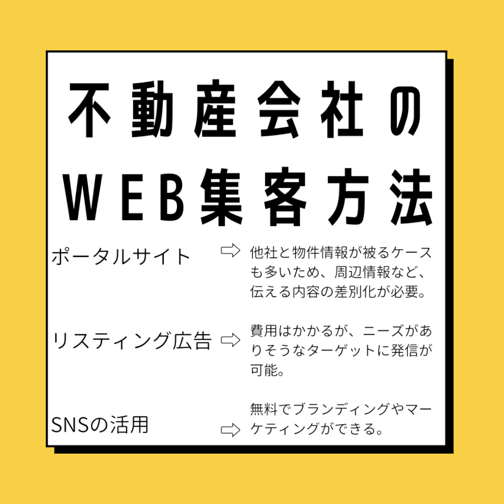 不動産会社がWeb集客を行う際は、大手ポータルサイトを利用するか、リスティングなどの広告方法に目を向けるかをターゲットに沿って見極めることが大切です。